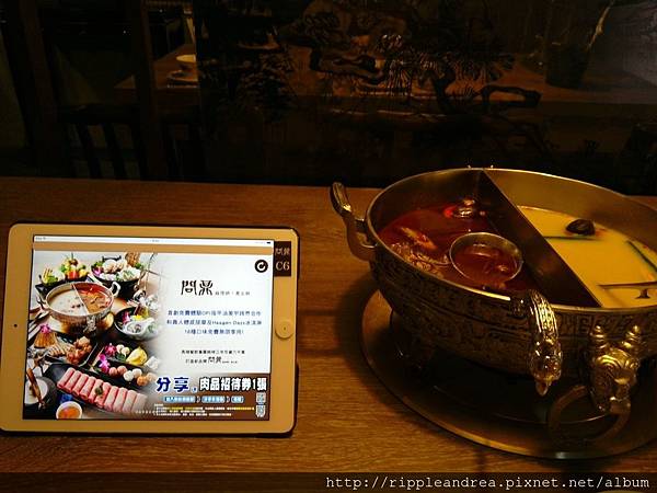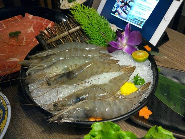 差不多該步入正題了,看了價錢後,我們兩人點了大概1300左右﹝跟我們平常吃信義馬辣吃到飽兩人價格差不多,我們頗愛吃馬辣﹞。「問鼎」湯底有「麻辣鍋」、「養生鍋」、「酸菜鍋」、「蔬菜鍋」,我們選了麻辣+養生,麻辣鍋底的部分可以一直加豆腐及鴨血,另外點了安格斯黑牛、大蝦、干貝、萵苣、高麗菜、綜合丸(三種口味,我最愛牛肉爆起司,照片沒拍到,其他兩種我沒什麼感覺)、油條、烏龍麵(以上全部吃光光)。